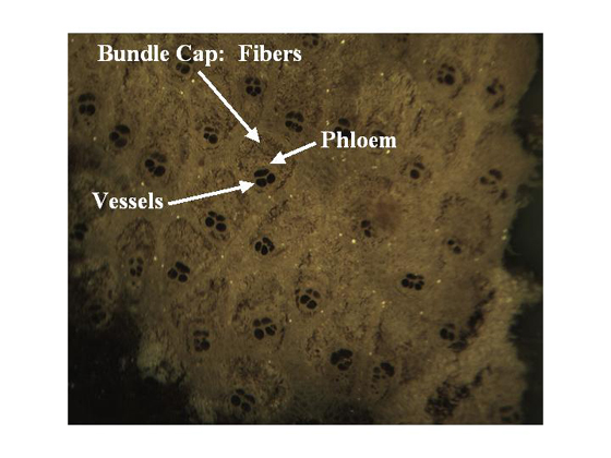above lack the fibrous bundles. The next image zooms in on a fibrovascular bundle and fibrous bundle at 150x with a Dino-Lite AD7013 MT 5.0 MP. The image was resized in Adobe Photoshop CS6.